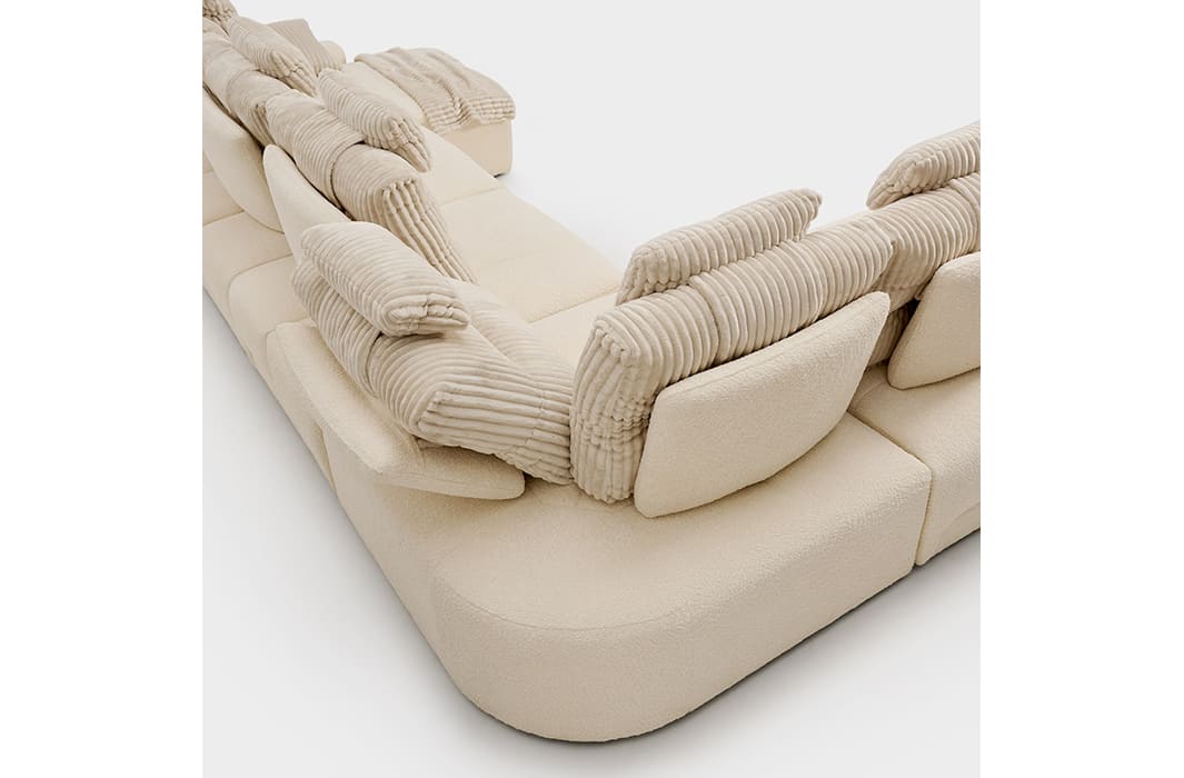 Composición modular: disponible en 2, 3 plazas, chaisslongue, módulo rincón, pouff terminal y pouff.