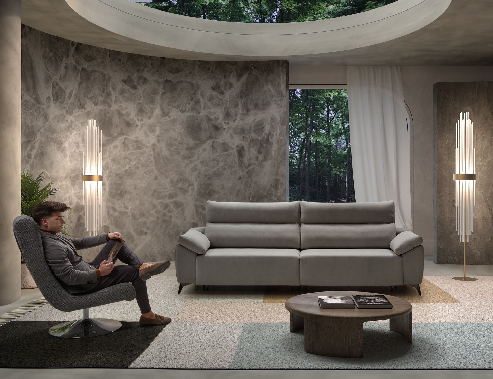 Esta pieza está diseñada con el Sistema Forte. Sistema patentado que consiste en un deslizante carro que permite desplazar la sentada a la vez que se reclina el respaldo, convirtiendo cada asiento en una chaisslongue. Su ligereza en el diseño y su tecnología, lo convierten en un sofá muy actual y delicado.